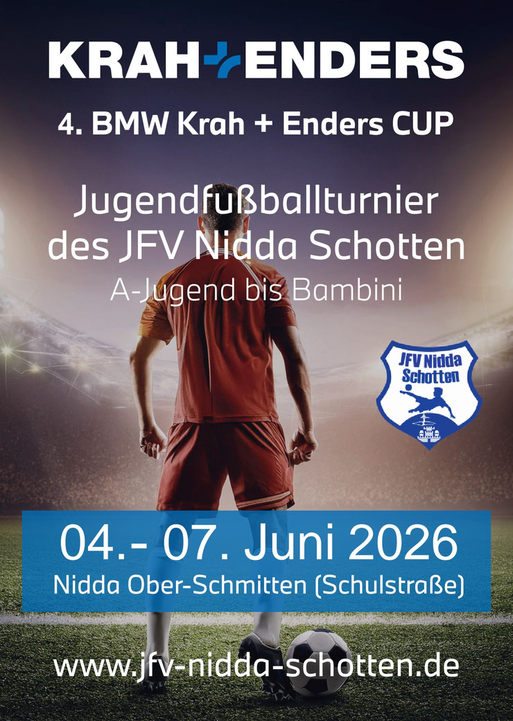 Seit 2023 veranstaltet der JFV Nidda/Schotten in Kooperation mit unserem Hauptsponsor, dem BMW Autohaus Krah+Enders, ein großes Jugendfußball-Turnier für alle Altersklassen. Mit ca. 100 Mannschaften aus ganz Hessen und etwa 1500 Spielerinnen- und Spieler, bietet das Turnier Jugendfußball auf ganz hohem Niveau. Von der Hessen- bis zur Kreisliga ist alles vertreten.